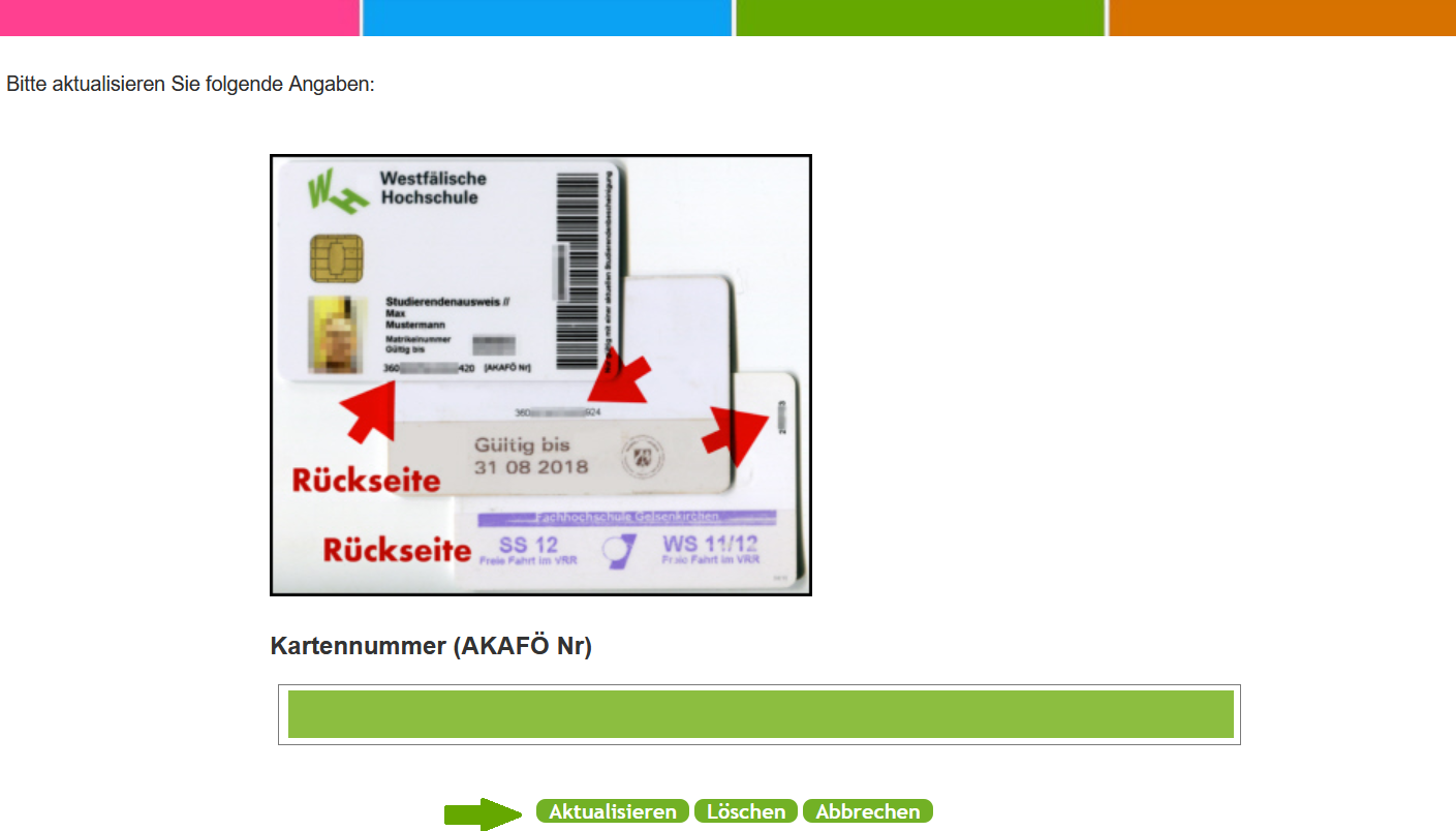 - Im nächsten Fenster erscheint ein Bild auf dem Sie zu sehen bekommen wo Ihre Akafö Nummer zu finden ist. Auf der Vorderseite im unteren Bereich Ihres Studentenausweis. Diese geben Sie bitte in das Feld unten ein. Und klicken anschließend auf Aktualisieren.