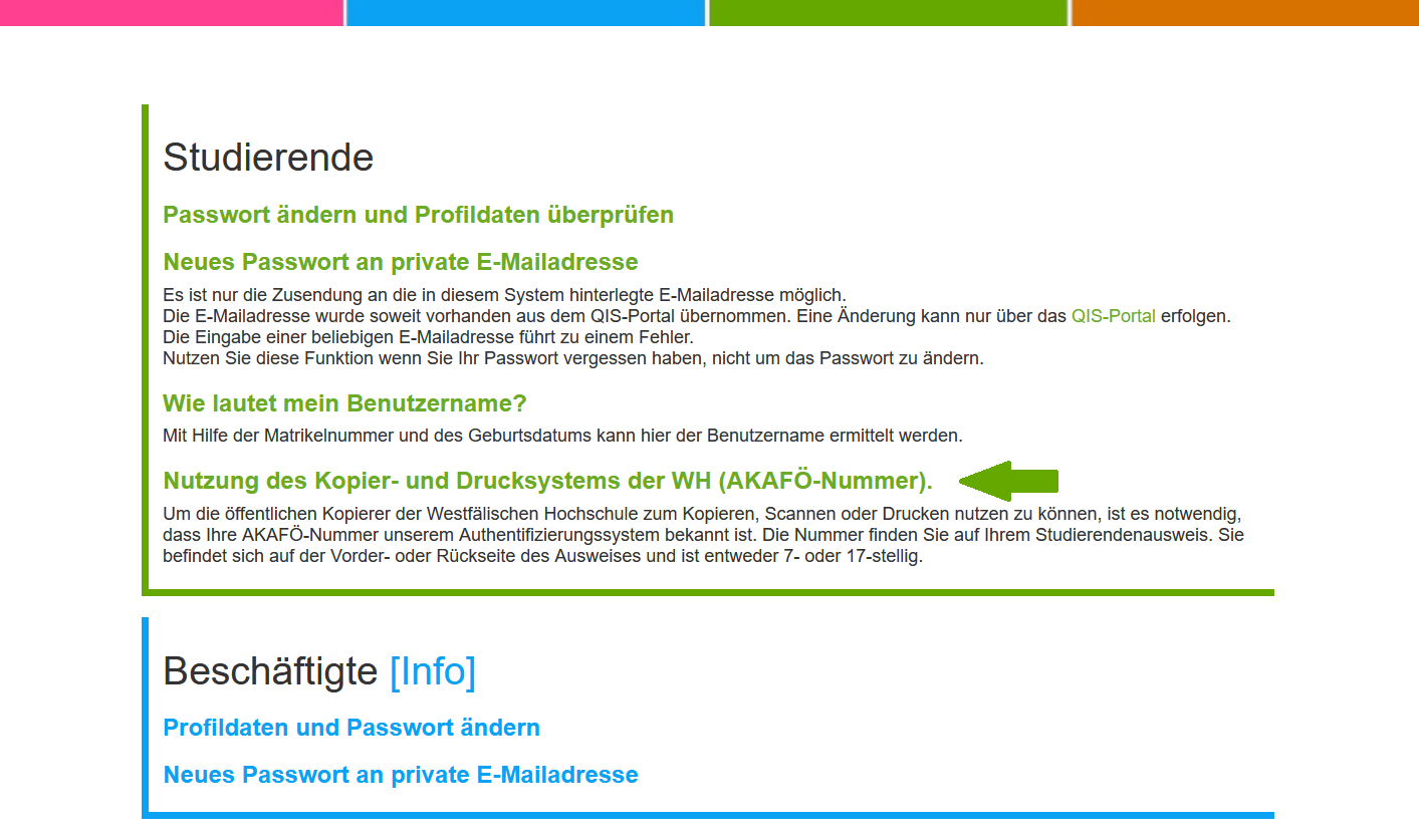 - Besuchen Sie die Homepage Account.w-hs.de, anschließend gehen Sie auf Nutzung des Kopier- und Druckersystems der WH (AKAFÖ-Nummer).