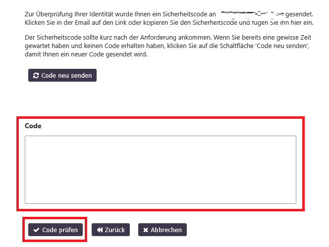 6. Tragen Sie den in der E-Mail übermittelten Sicherheitscode in das Eingabefeld ein und klicken Sie auf „Code prüfen“