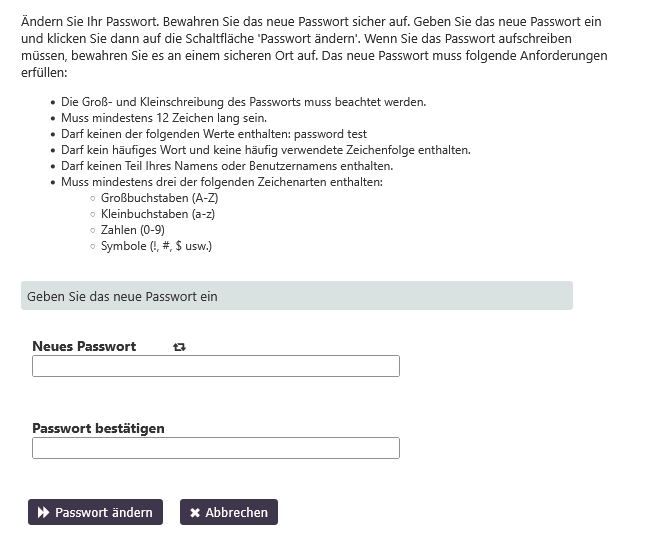 8. Geben Sie das neue Passwort in das Feld „Neues Passwort“ ein. Achten Sie auf die Vorgaben zur Passwortsicherheit. Wenn Ihr Passwort den Vorgaben entspricht wird ein grüner Haken eingeblendet. Tragen Sie dasselbe Passwort in das Feld „Passwort bestätigen“ ein. Klicken Sie auf „Passwort ändern“.