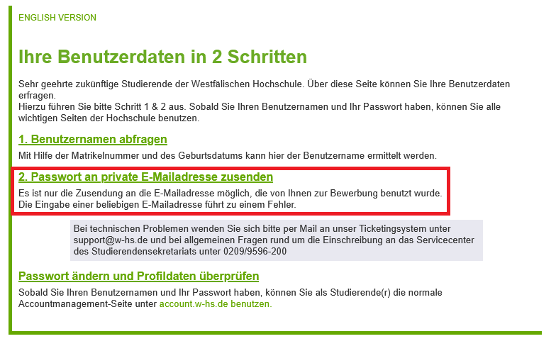 2. Klicken Sie auf den Link „2. Passwort an private E-Mailadresse zusenden“, bzw. „Neues Passwort an private E-Mailadresse“