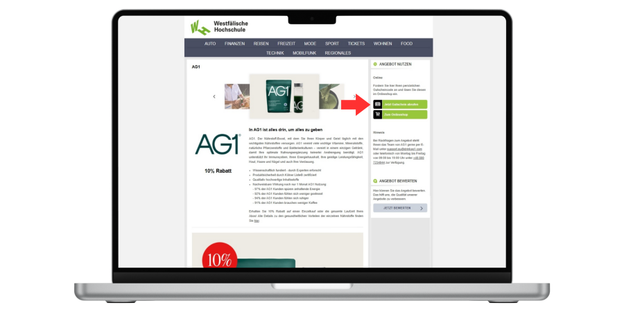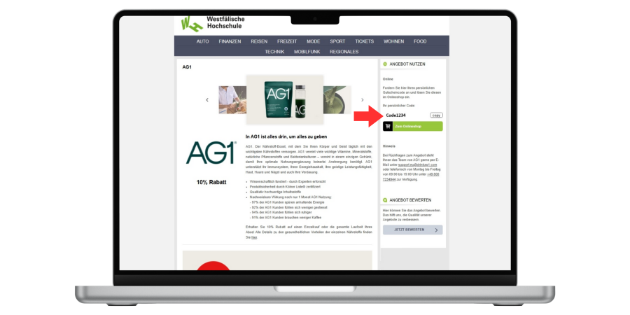 Dieser Code kann dann anschließend im Onlineshop und/oder vor Ort in den Filialen (näheres entnehmen Sie immer dem jeweiligen Angebot) eingelöst werden. Über die Plattform können Sie mit einem Klick direkt zum Onlineshop des jeweiligen Markenanbieters wechseln. Ab hier befinden Sie sich außerhalb des Vorteilsportals und führen Ihre Bestellung direkt privat beim Anbieter (in diesem Beispiel AG1) durch. Die Corporate Benefits-Plattform erhält keine Daten zu Ihren getätigten Käufen. Gegebenenfalls ist eine weitere Registrierung beim Anbieter erforderlich (oftmals kann man aber auch als „Gast“ bestellen). Wir empfehlen Ihnen ab hier die private E-Mail-Adresse bzw. Kontaktdaten anzugeben. An der entsprechenden Stelle im Bestellvorgang – meist im Rahmen der Angabe zur Zahlungsmethode – kann der zuvor kopierte/notierte Gutscheincode dann eingegeben werden. Der Rabatt wird dann von der Bestellsumme abgezogen.