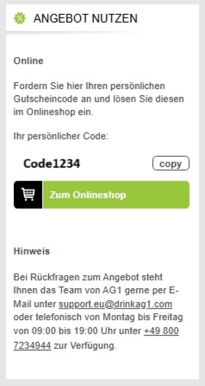 Dieser Code kann dann anschließend im Onlineshop und/oder vor Ort in den Filialen (näheres entnehmen Sie immer dem jeweiligen Angebot) eingelöst werden. Über die Plattform können Sie mit einem Klick direkt zum Onlineshop des jeweiligen Markenanbieters wechseln. Ab hier befinden Sie sich außerhalb des Vorteilsportals und führen Ihre Bestellung direkt privat beim Anbieter (in diesem Beispiel AG1) durch. Die Corporate Benefits-Plattform erhält keine Daten zu Ihren getätigten Käufen. Gegebenenfalls ist eine weitere Registrierung beim Anbieter erforderlich (oftmals kann man aber auch als „Gast“ bestellen). Wir empfehlen Ihnen ab hier die private E-Mail-Adresse bzw. Kontaktdaten anzugeben. An der entsprechenden Stelle im Bestellvorgang – meist im Rahmen der Angaben zur Zahlungsmethode – kann der zuvor kopierte/notierte Gutscheincode dann eingegeben werden. Der Rabatt wird dann von der Bestellsumme abgezogen.