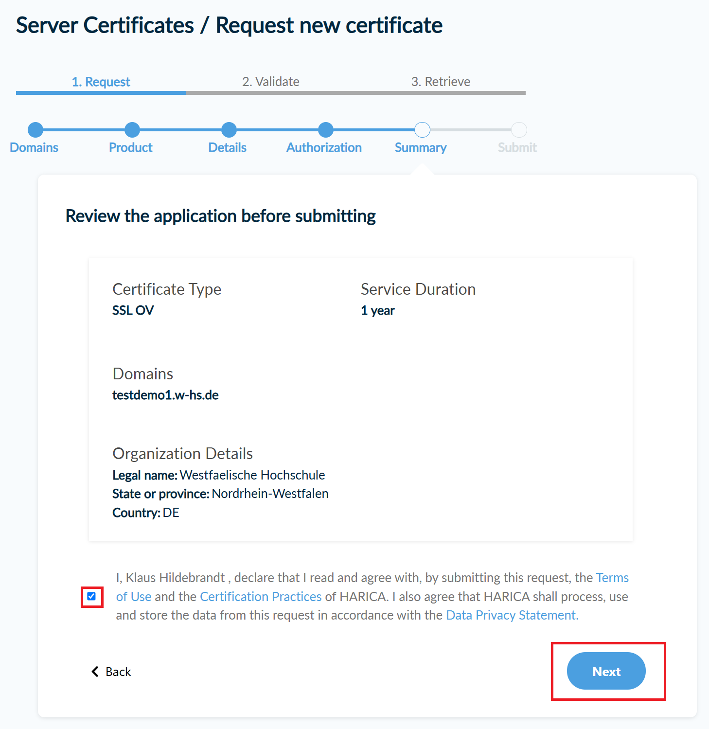 - Es erfolgt eine Übersicht der getätigten Eingaben. Hier die Checkbox anklicken und „Next“ auswählen.