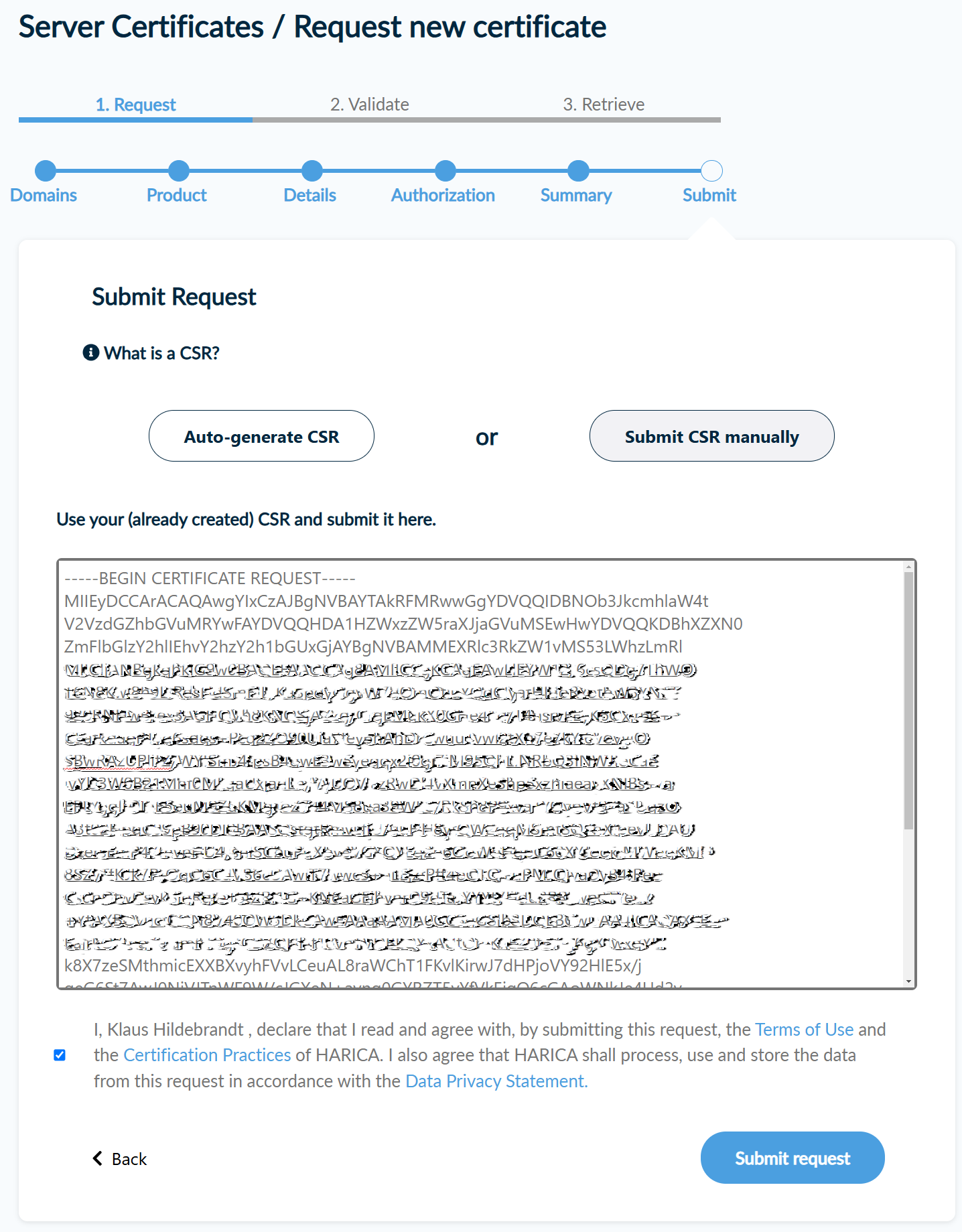 „Submit CSR manually“ anklicken anklicken und in dem aufgehenden Eingabefeld den CSR hineinkopieren.
