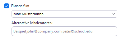 Person 1 kann die Einstellungen unter https://zoom.us/profile/setting ziemlich weit unten vornehmen. Dort auf das Pluszeichen neben „Planungsberechtigung zuweisen an“ klicken. Dort die Emailadresse von Person 2 angeben.