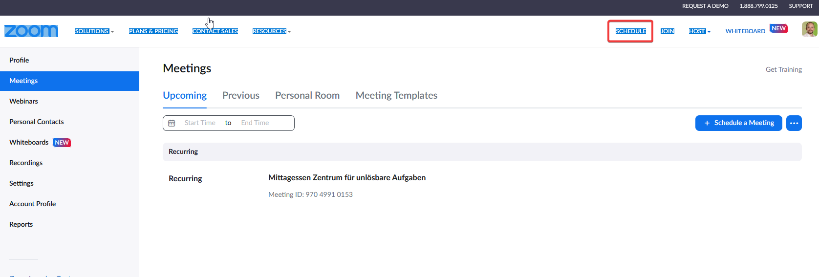 Dafür muss das Meeting über www.zoom.us angelegt werden. Nachdem Sie sich eingeloggt haben legen Sie über „Schedule“ ein neues Meeting an.